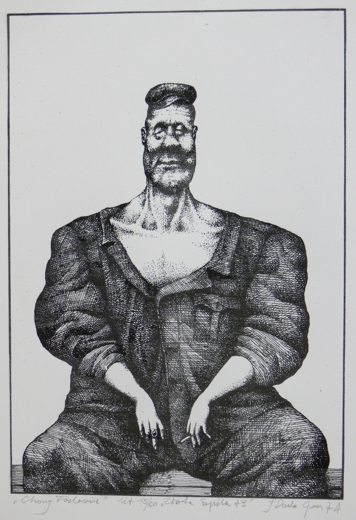 Urzeka mnie bardzo to spojrzenie spod papierowej czapki. Jest takie skupione i wnikliwe. Mocno pokazuje stosunek artysty do ówczesnego świata i to, w jaki sposób przedstawiał go w swoich obrazach. Dokumentalista wszechobecnej głupoty, demaskujący wszystkie wady i grzechy prowincjonalnego świata – małych, polskich, zapyziałych miasteczek, których był integralną częścią. Jerzy Duda-Gracz posiadał niezwykłą biegłość warsztatową i techniczną, mógł malować piękne pejzaże i poprawne portrety, postanowił jednak robić to co uważał za stosowne – malować Polskę i Polaków od ich ciemnej i czasami wręcz śmierdzącej strony. Malarz obnaża i wyciąga na wierzch wszystkie łajdactwa, jest przy tym jednak bardzo sprawiedliwy – nie ocenia i nie obraża, niejednokrotnie szczerze współczując. Cenię sobie bardzo łajdactwa gracza, bo są bardzo głębokie. Jego portrety tylko na pozór skupiają się na samej fizyczności, tak naprawdę będąc również portretami wewnętrznymi. To najbardziej poruszające (i często kontrowersje) portrety Polaków jakie miałam okazję oglądać podczas trwającej do 28 października wystawy retrospektywnej zorganizowanej przez Nowohuckie Centrum Kultury w Krakowie. To jedyna taka możliwość być oko w oko z artystą i z jego pracami, szczególnie, że w całości pochodzą z prywatnej kolekcji rodziny i nie są na co dzień eksponowane w żadnym muzeum. Nie jest to wystawa jedna z wielu, która pokazuje po prostu ładne czy dobre rzeczy. To krzywe zwierciadło naszego społeczeństwa, w którym z łatwością dostrzeżemy sytuacje i postacie doskonale nam znane. Gracz malował w ciężkim okresie socjalizmu i jego obrazy będąc o tym nieustannie przypominać, okazuje się jednak, że z równie dużą mocą działają także dziś, że są uniwersalne, podobnie jak i wszystkie życiowe zakręty i łajdactwa. Wiele rzeczy uległo zmianie, ale mentalność wydaje się być wciąż tak samo upierdliwa i niezdolna do jakichkolwiek reform. Artysta pokazuje wyraźnie, że i wtedy i dziś walka z nią okazuje się być walką z wiatrakami. Polecam wam gorąco, naprawdę warto to zobaczyć.