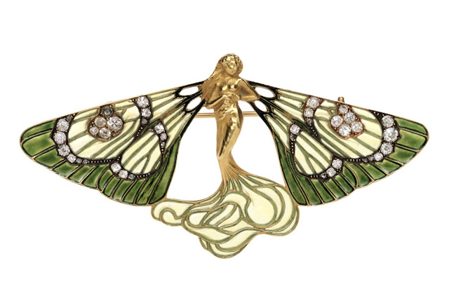 Zwłaszcza tę autorstwa francuskiego projektanta René Lalique. Secesja w swojej miłości do motywów roślinnych i zwierzęcych upodobała sobie w biżuterii zwłaszcza motyle i ważki a ja, nie widziałam nigdy piękniejszych od tych, właśnie z warsztatu Lalique. Biżuteria jaką noszę sprowadza się do pierścionka zaręczynowego i obrączki, ale z ręką na sercu przyznaje, że taką broszkę lub naszyjnik ubrałabym z wielką przyjemnością.