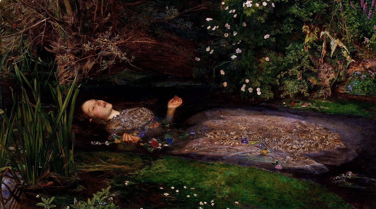 Bardzo mi przykro, ale nie żyje także Ofelia. Trzeba przyznać, że jak na topielca, a raczej topielicę wygląda na obrazie Millaisa wyjątkowo ślicznie. Wiem, to pewnie dlatego, że jest tu jeszcze w miarę ciepła. Po prostu nie zdążyła podpuchnąć. A może jeszcze żyje i nadal tonie, cały czas słodko przy tym śpiewając? Królowa Gertruda własnie tak opisywała w „Hamlecie” jej śmierć. Ładne kwiatki.