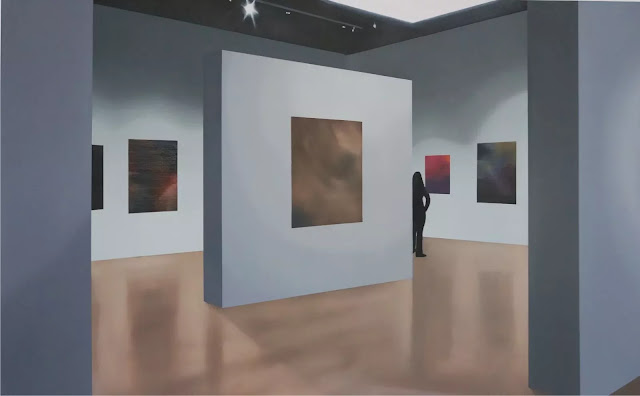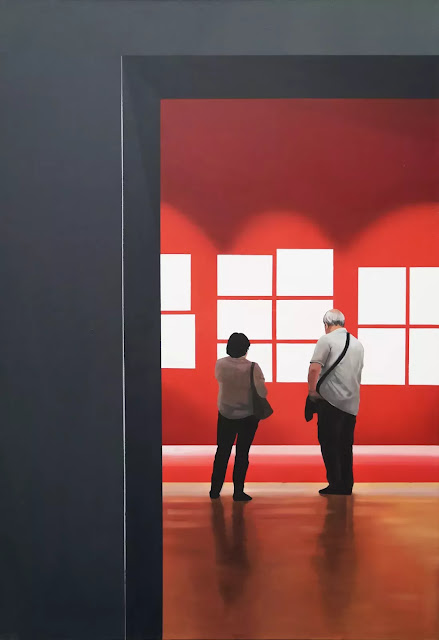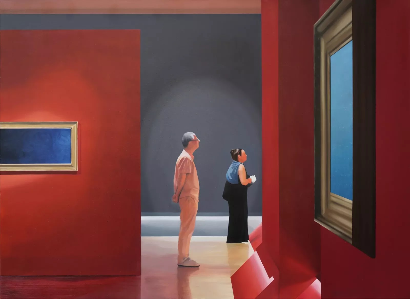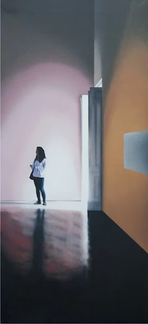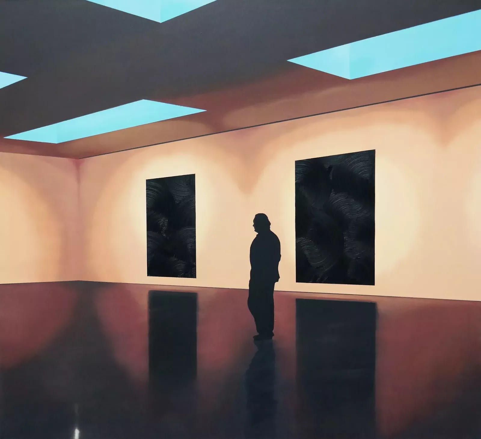 Muzeum jest mi bardzo bliskie, zarówno jako instytucja w której pracuje, jak i przestrzeń w obrębie której wpatruję się w prezentowaną sztukę. Sale ekspozycyjne mają w sobie coś z atmosfery sacrum, są miejscem, które niczym świątynie przechowują cenne relikwie, księgi i wizerunki świętych. Cykl „Muzeum” Mateusza Maliborskiego to bardzo dyskretny i intymny ułamek ekspozycyjnych przestrzeni, w którym zwiedzający uchwyceni zostali podczas kontemplacji i oglądania dzieł sztuki. Jego obrazy niczym szybkie, fotograficzne kadry z ukrycia, doskonale oddają atmosferę spokojnego zwiedzania w sytuacji chyba najbardziej pożądanej – bez tłumów i denerwującego ścisku. Na obrazach Maliborskiego zwiedzający mają pełen komfort obserwowania sztuki, nikt im nie przeszkadza, nawet sam artysta, który nie wkracza w ich przestrzeń i ogląda ich z ukrycia. Odpowiada mi bardzo obecna w dziełach pustka, przełamana jedynie niewielką sylwetką człowieka i wiszącymi na ścianach obrazami. To, co widnieje na malowanych płótnach nie jest jednak istotne, ważniejsza jest tutaj więź z dziełem sztuki oraz, bardzo dobrze oddana, pusta, muzealna przestrzeń.