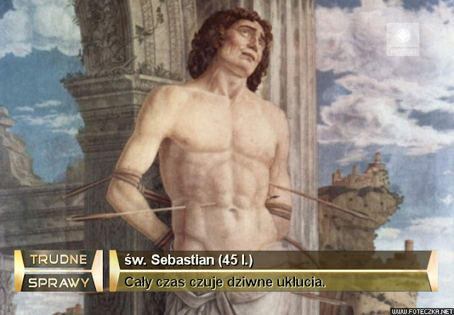 Andrea Mantegna, włoski malarz renesansowy w 1480 roku namalował Św. Sebastiana, który w ikonografii przedstawiany jest zawsze podczas swojej męczeńskiej śmierci, przebity wieloma strzałami.