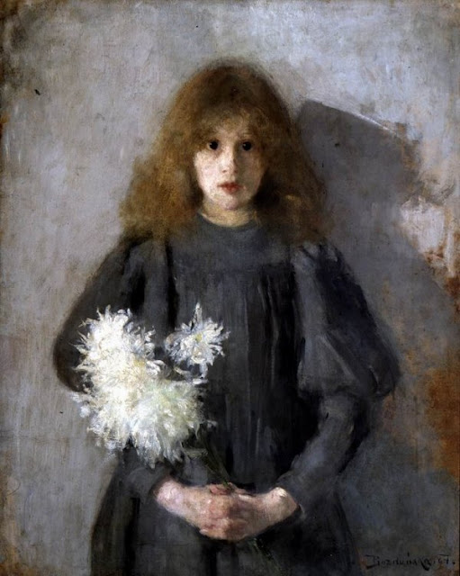 To jeden z nielicznych obrazów tej malarki, który szczerze lubię. Należę bowiem do tych, którzy za Boznańską mocno nie przepadają, choć, rzecz jasna, bardzo doceniam jej twórczość oraz bezsprzeczny talent. Urzekają mnie w obrazie szarości, przełamane bielą bukietu kwiatów. Obraz jest piękny, ponieważ tchnie smutkiem i ciszą, jest bardzo kameralny, spokojny. Duże i czarne jak dwa węgielki, oczy dziewczynki wpatrują się uporczywie w widza, hipnotyzując go.