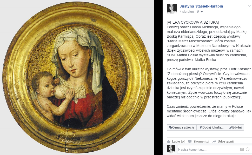 Dotknięta falą skrajnych opinii, związanych z zażyłą dyskusją dotyczącą karmienia piersią w miejscu publicznym, pomyślałam sobie, że przecież sztuka zna doskonale mnóstwo takich laktacyjnych przykładów. Napisałam nawet o tym w krótkim poście, który umieściłam na swoim prywatnym profilu. Wynika z niego, że nawet w średniowieczu karmienie w miejscu publicznym było czymś zupełnie normalnym i naturalnym. Mentalne średniowiecze, tak się czasami mówi, aby uznać coś za bardzo zacofane, prawda? Jak widać, czasami nawet do tego średniowiecza jeszcze nam bardzo daleko.