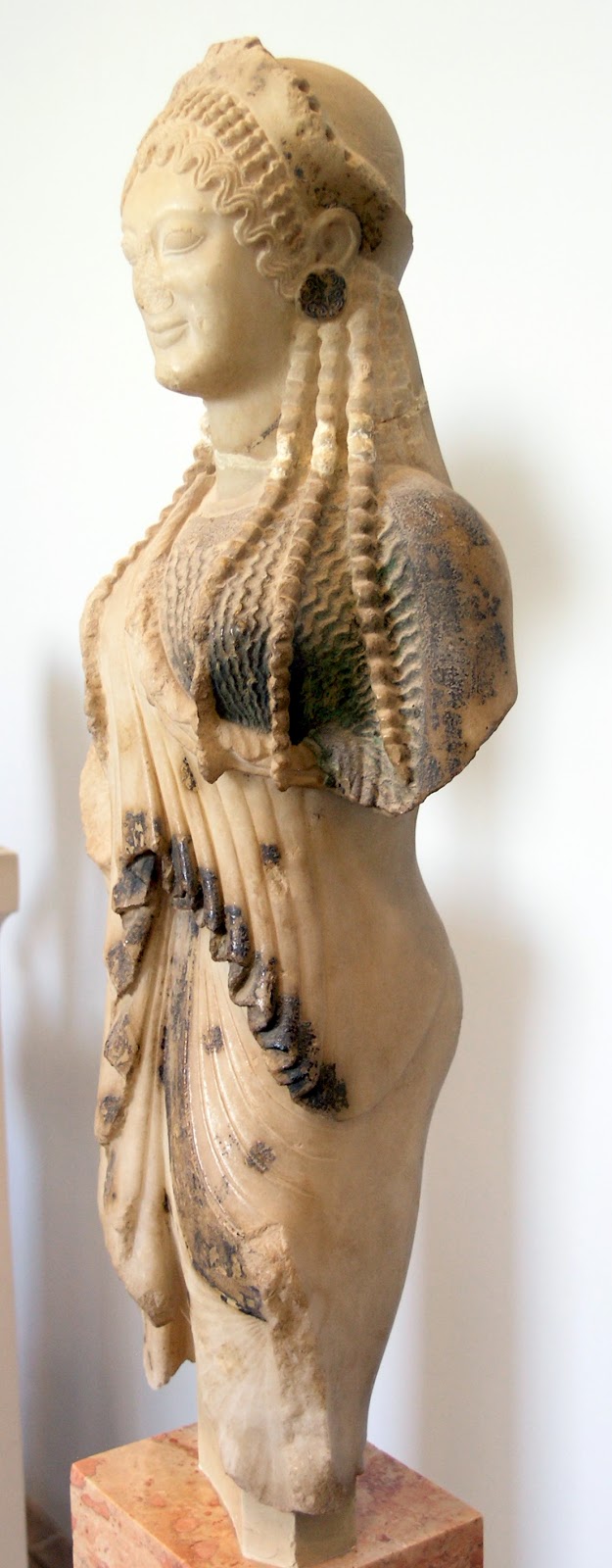 Myślę, że omawianie warto zacząć od kory, czyli typu kobiecej postaci pojawiającej się w pierwszym z trzech okresów, czyli archaicznym (ok. 720/700-480 p.n.e.) Kora i kuros, to taki antyczny duet, w którym postać męska (przedstawiana nago) była pretekstem do udoskonalania ludzkiej sylwetki, a kobieca pozwalała na skupianie się na dekoracyjności, zwłaszcza włosów i szat. Najczęściej reprodukowaną i najpopularniejszą jest kora z Akropolu, nosząca charakterystyczne cechy rzeźby archaicznej, a więc frontalność, statyczność, konwencjonalność oraz niezbędny, obligatoryjny „archaiczny uśmiech”.