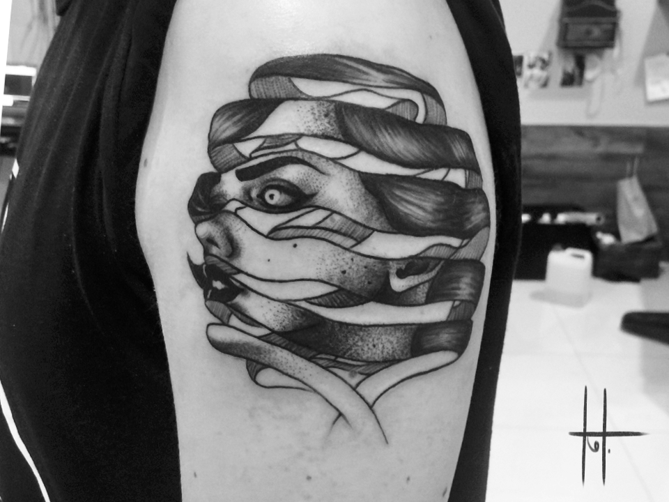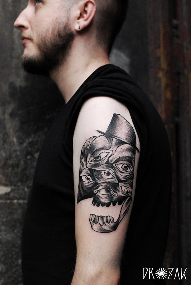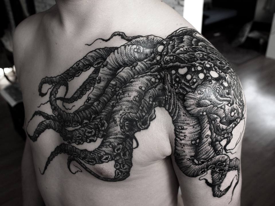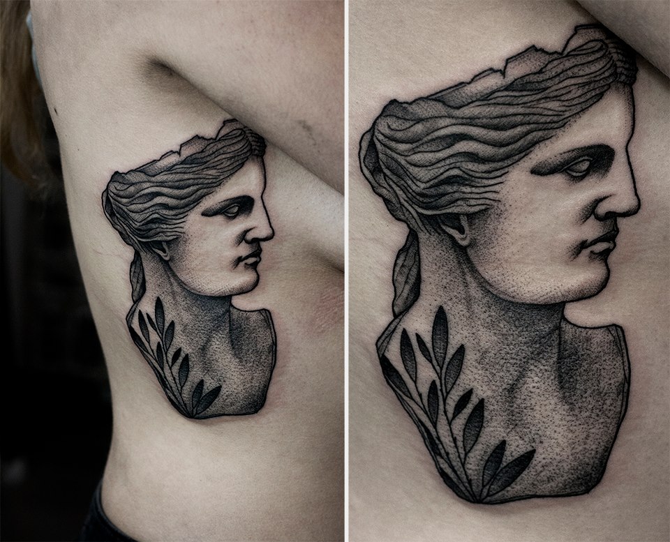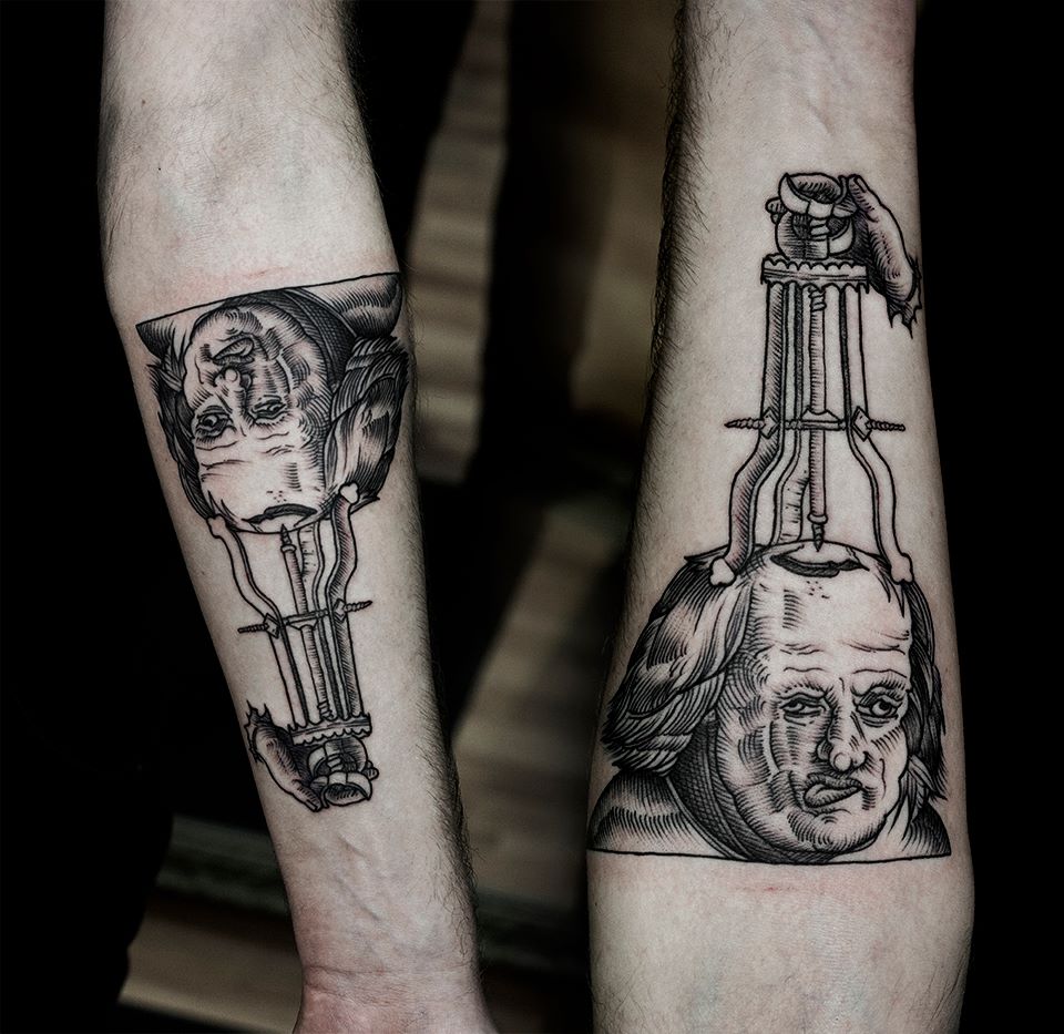 Bez względu na to czy Heyro „kreskuje” czy „kropkuje” tatuaż, robi to w świetny i bardzo charakterystyczny dla siebie sposób. Zachwyca mnie zwłaszcza charakter niecodziennych wzorów, które realizuje artysta, szczególnie, że wiele z nich pochodzi ze świata sztuki. Jest tu miejsce na starą rycinę o dość makabrycznym charakterze, na rysunek Hansa Holbeina czy fragment rzeźby greckiej, a wszystko to zrealizowane w stylistyce, będącej unikatową wizytówką artysty.