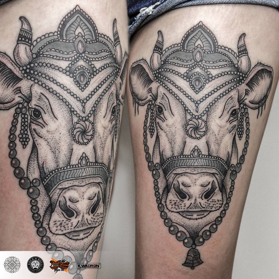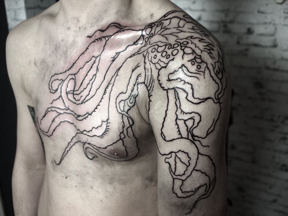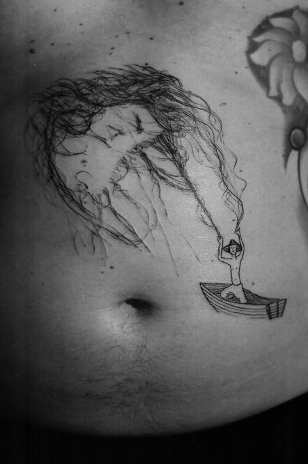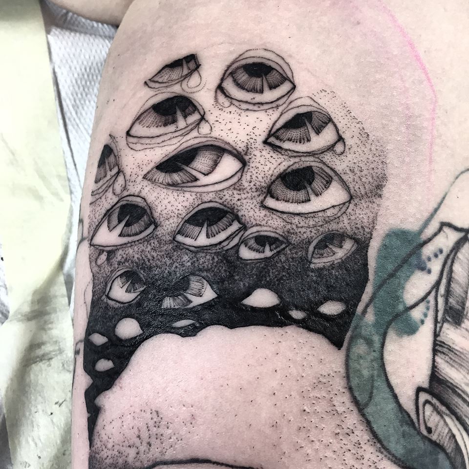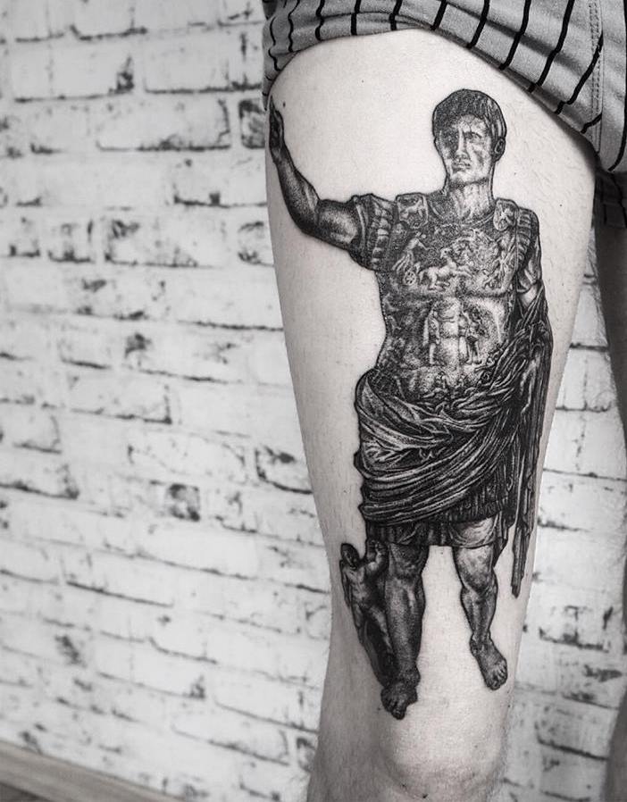 Bez względu na to czy Heyro „kreskuje” czy „kropkuje” tatuaż, robi to w świetny i bardzo charakterystyczny dla siebie sposób. Zachwyca mnie zwłaszcza charakter niecodziennych wzorów, które realizuje artysta, szczególnie, że wiele z nich pochodzi ze świata sztuki. Jest tu miejsce na starą rycinę o dość makabrycznym charakterze, na rysunek Hansa Holbeina czy fragment rzeźby greckiej, a wszystko to zrealizowane w stylistyce, będącej unikatową wizytówką artysty.