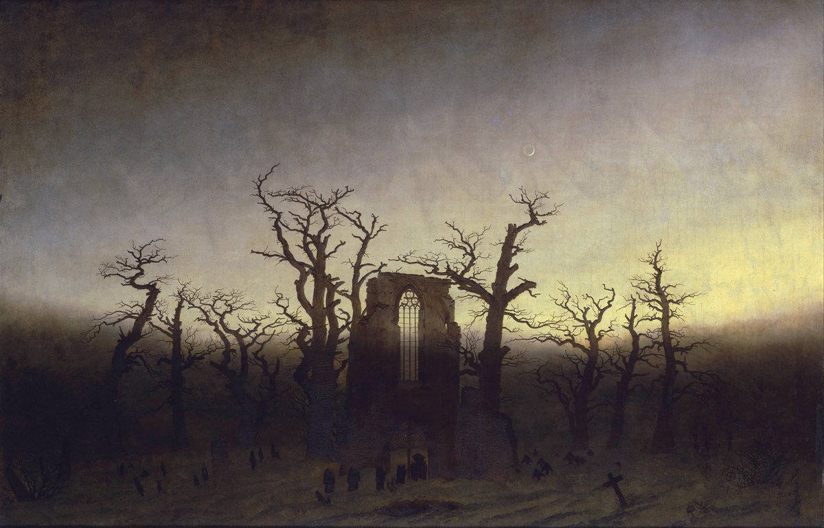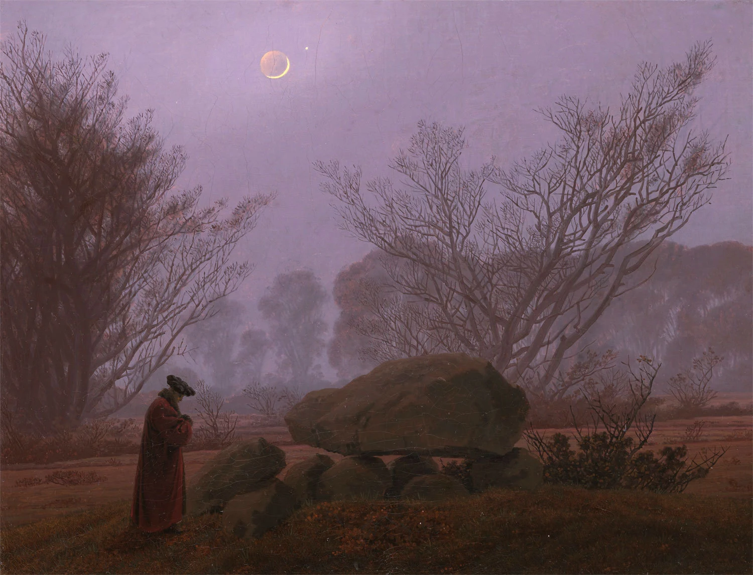 W takich okolicznościach zatęskniłam do Caspara Davida Friedricha (1774-1840). Obiecałam sobie, że jak tylko znajdę chwilę na napisanie notki, to będzie dotyczyć właśnie jego romantycznego i metafizycznego spojrzenia na naturę. Niczego tak mi teraz nie potrzeba, jak malarskiego poczucia absolutu, sięgnięcia dużo wyżej, ponad przyziemne sprawy i codzienne rozterki. Friedrich daję mi tę możliwość, ponieważ jego pejzaże przesycone są boskim pierwiastkiem. Malarz kontemplował przyrodę w zupełnym skupieniu, które można porównać do zadumy, w jaką człowiek wierzący popada podczas modlitwy, czy w trakcie przebywania w świątyni. Takie doświadczenie wymaga zupełnego odosobnienia. Artysta mawiał: