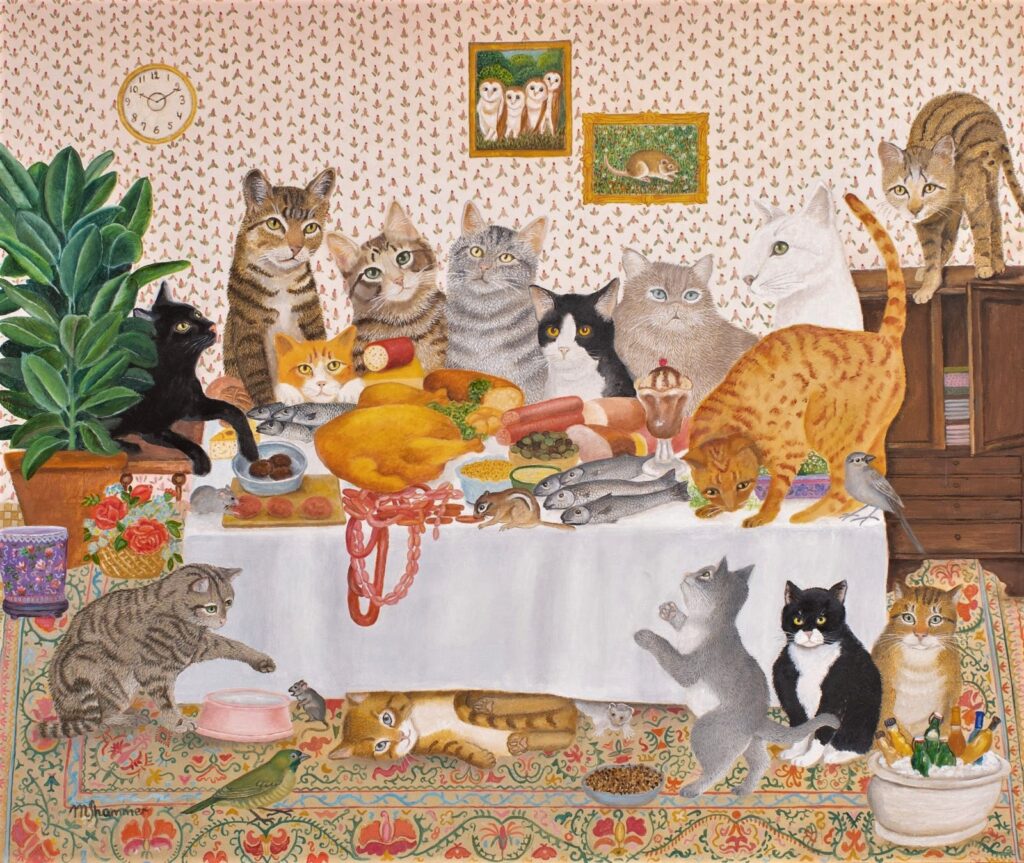 (Obraz w tle: Magdalena Shummer, „Obiad kotów”, 2003, własność Państwowego Muzeum Etnograficznego w Warszawie)