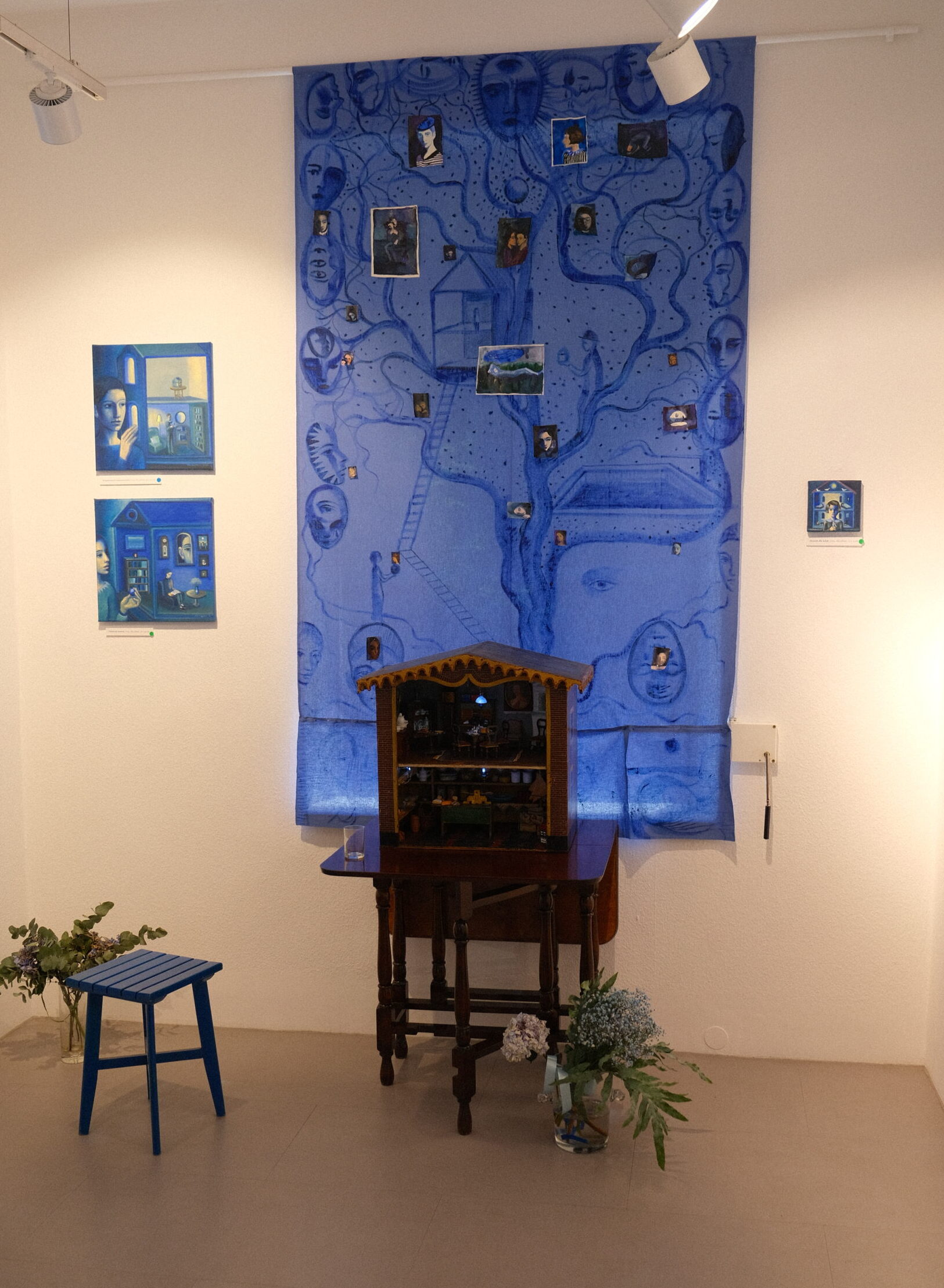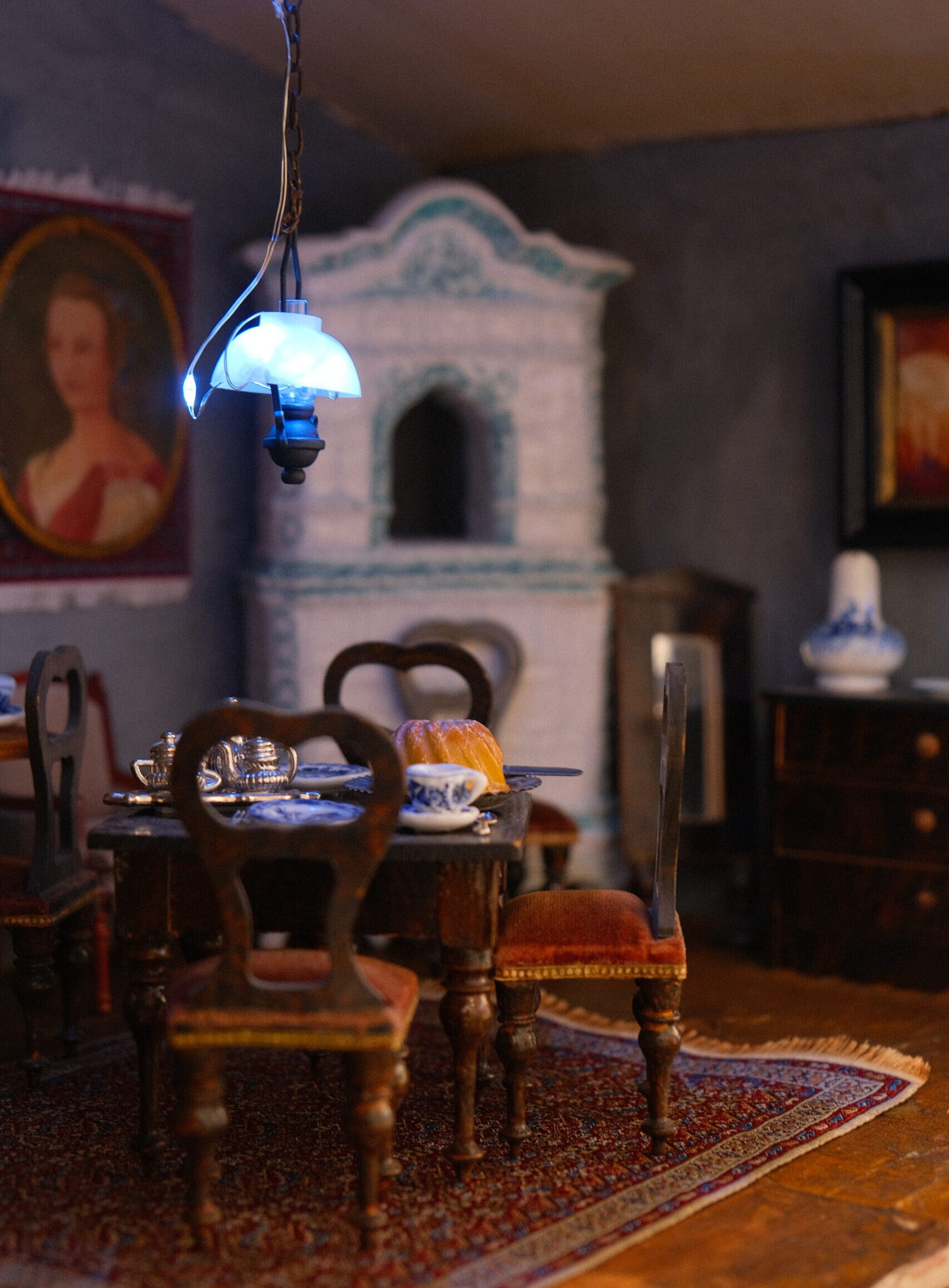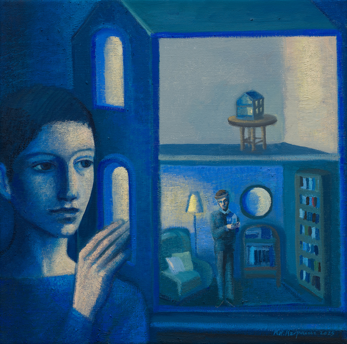 Warto dodać, że na wystawie w Galerii Artemis znajduje się obiekt szczególny, który zainspirował artystkę do stworzenia kilku korespondujących z nim prac. To XIX-wieczny, niderlandzki domek dla lalek należący do prof. Piotra Oczki, świetnego historyka sztuki, kolekcjonera i znawcy sztuki niderlandzkiej. Zaglądanie do takiego domku, wyposażonego w meble i sprzęty z pieczołowitą dokładnością jest dla mnie czymś bardzo fascynującym. To nie tylko powrót do dziecięcych marzeń o własnym domku – któż nie marzył! – ale też możliwość wglądu w nową, intymną przestrzeń, która odsłania przed nami pociągające detale i zakamarki. Tutaj łatwiej przestawić meble, zaaranżować wnętrze i zbudować alternatywną narrację, możliwą do zmiany niemal w każdym momencie.