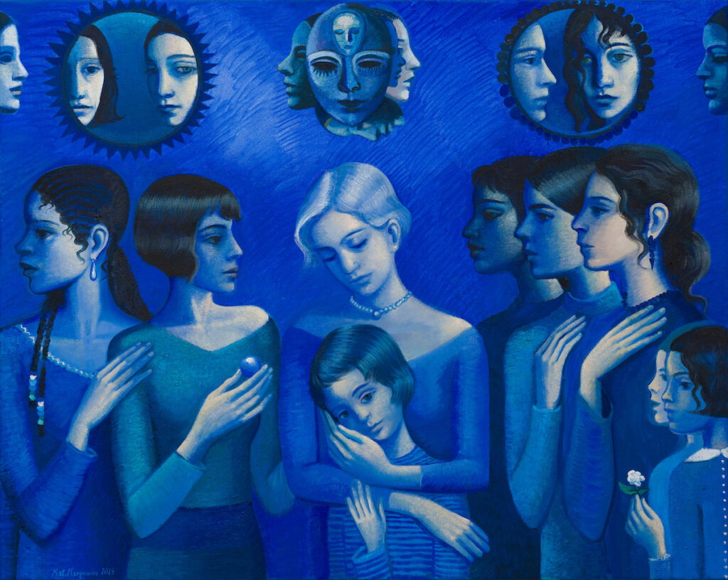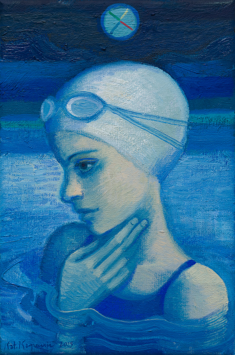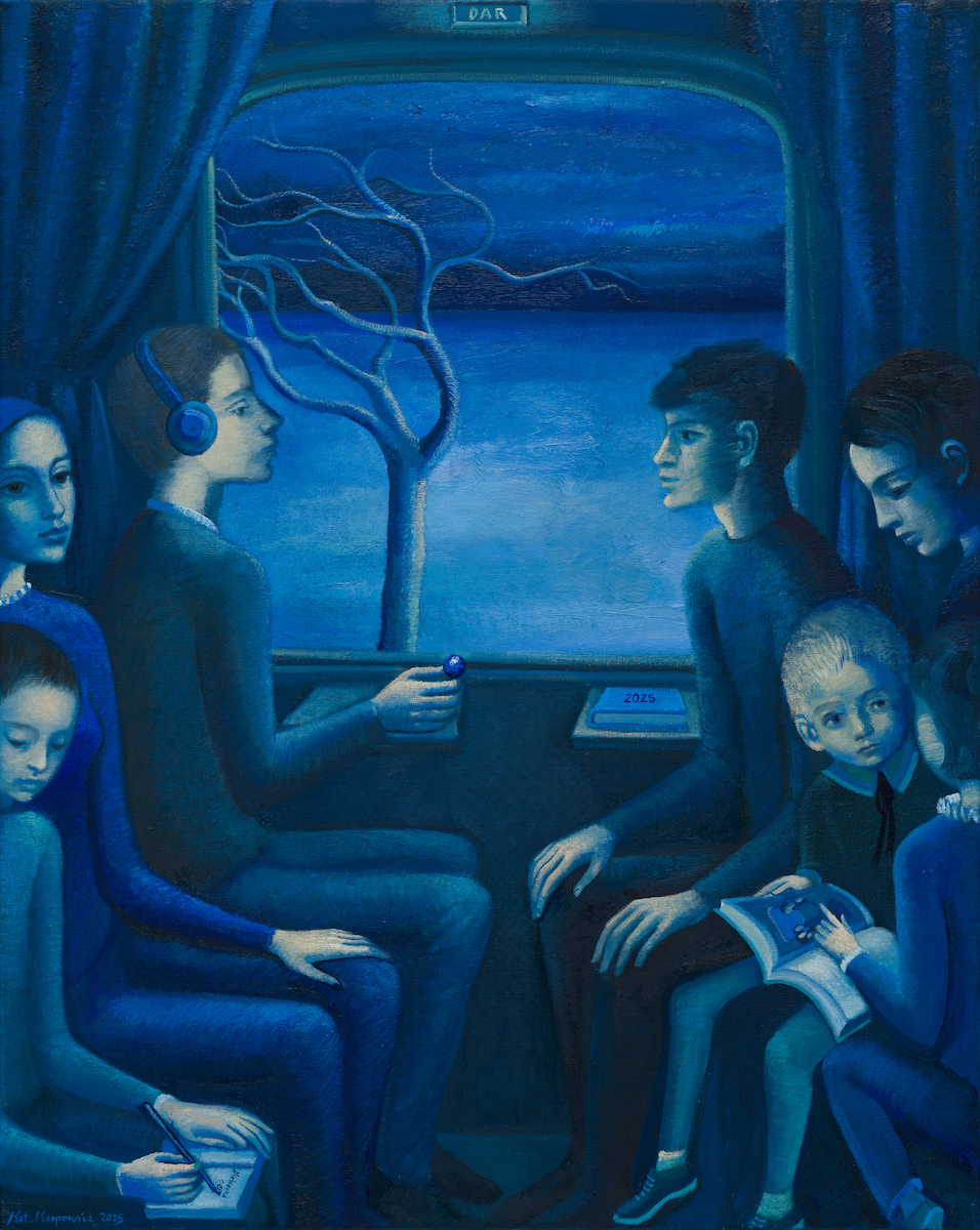 Kasia śni wyjątkowo, bo na niebiesko. To zawężenie palety kolorystycznej i operowanie odcieniami błękitu sprawia, że wszystkie prace posiadają melancholijny nastrój. To właśnie kolor najpełniej sugeruje nam oniryczność tych obrazów. Jest w nich coś z okresu błękitnego Pabla Picassa, ale u Karpowicz wydźwięk dzieł jest inny, łagodniejszy, chociaż przepełniony nostalgią. Artystka maluje z wyobraźni i pamięci, czerpiąc przy okazji ze skarbnicy podświadomości. Opowieści, które snuje są bardzo osobiste: to wspomnienia ważnych miejsc i podróży, wyraz głębokiej tęsknoty za bliskimi, którzy fizycznie odeszli. To także opowieści o sobie, bardzo osobista forma autorefleksji, wejrzenia, czy raczej wpłynięcia w głąb siebie.