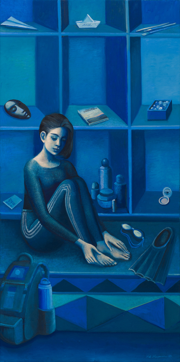 Motyw wody jest tu bardzo szczególny, bo tytułowy kolor kojarzy się artystce z kojącą czynnością, jaką jest pływanie. Jak sama mówi, jest to moment, w którym odpoczywa i, otoczona wodą, czuje się bezpiecznie. Myślę, że właśnie dlatego otula na niebiesko całą serię 23 dzieł i pozwala, aby określone barwy były kluczowe w budowaniu nastroju. Czy chłodnego? Dla wielu pewnie tak, ale artystka przekonuje, że dla niej niebieski, zgodnie z dawnym postrzeganiem tego koloru, jest ciepły.