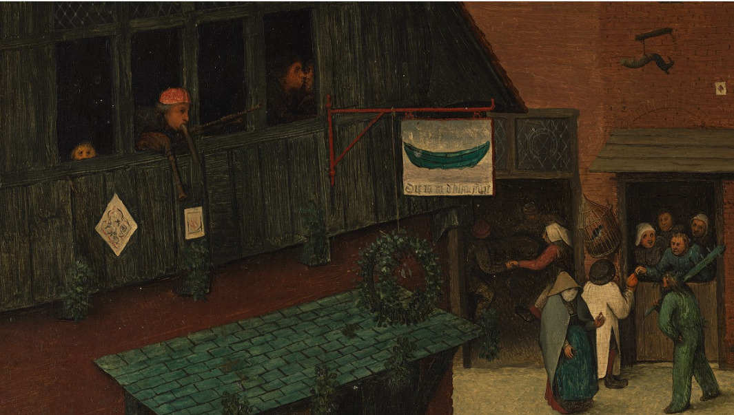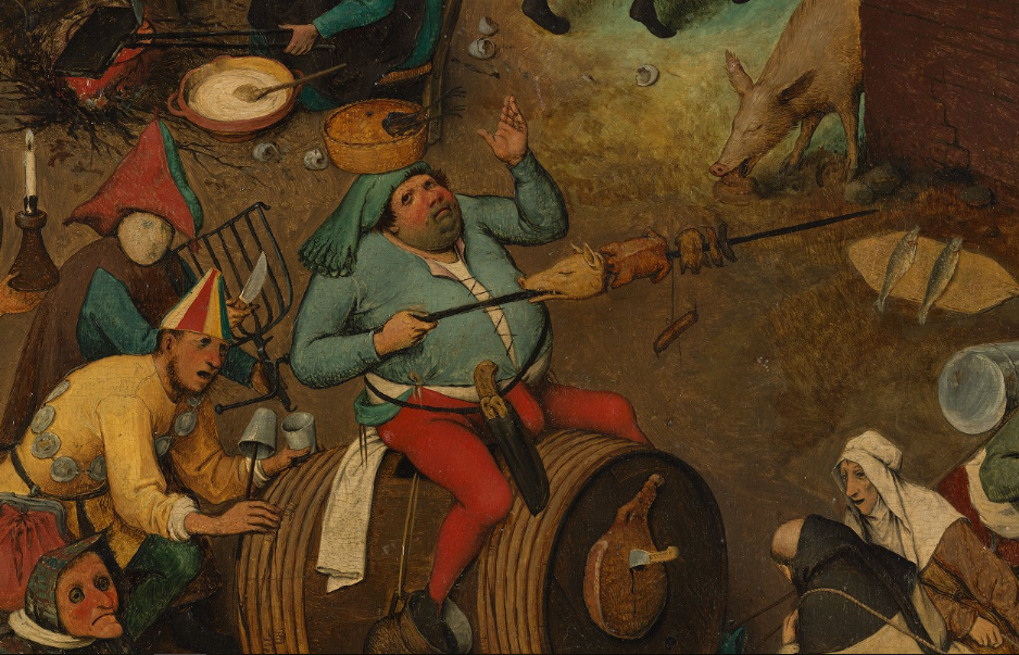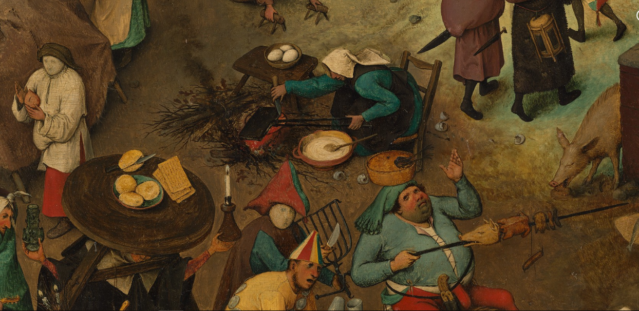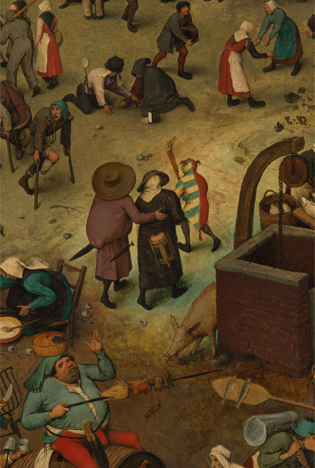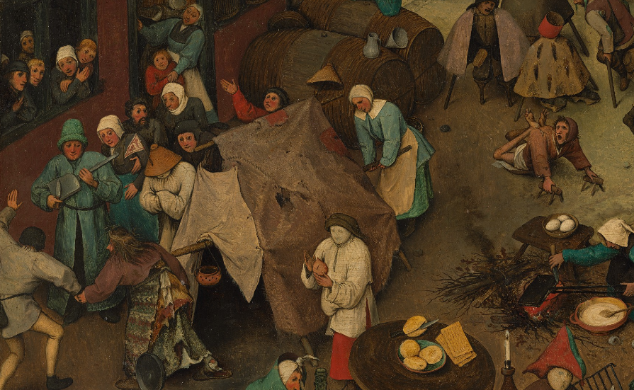 Lewą stronę kompozycji zajmuje tytułowy Karnawał, a więc grupa bawiących się beztrosko ludzi skupionych wokół najważniejszego dla nich budynku, czyli karczmy. Karnawał to czas rozluźnienia, odwrócenia ról i swobody moralnej. Panował wówczas znany już od czasu średniowiecza „świat na opak”, przepełniony groteską, ironią i humorem, pokazujący rzeczywistość odwrotną do tej codziennej, poprawnej, kształtowanej przez normy społeczne i religijne. Bruegel nie unika tu satyry, niektóre zachowania pokazując w sposób przerysowany i karykaturalny. Ludzie tańczą, piją, wymiotują. Przy takiej mnogości scen nie sposób omówić całego obrazu centymetr po centymetrze, ale na kilka z nich warto zwrócić szczególną uwagę. Nie wiem czy wiecie, ale na stronie Inside Bruegel można obejrzeć fotografie prac artysty w bardzo wysokiej rozdzielczości i przyglądać się im z bliska – to wspaniałe zajęcie, chociaż uprzedzam, że pożera czas! 🙂