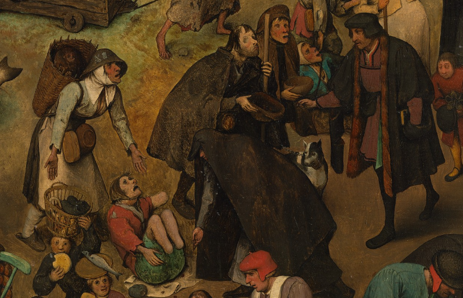 Wsparcie potrzebujących to ważny, wielkopostny gest związany z przykazaniem miłości bliźniego. Bruegel namalował tu zarówno osoby naprawdę potrzebujące jak i oszustów – w ten sposób można interpretować m.in. kobietę z małpą w koszyku, której ekspresyjne gesty mają za zadanie zwrócić na nią uwagę.